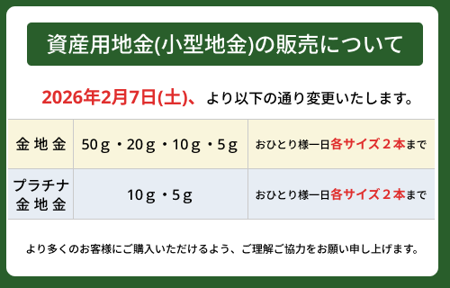 金地金、50g・20g・10g・5g、おひとり様一日各サイズ2本まで