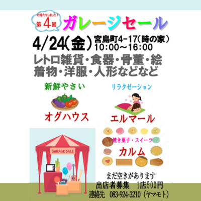 第3回 ガレージセールを開催します! 11月14日(金)、15日(土) 10時から15時までです。 気持ちのよい季節、各地で様々なイベントが開かれていますね。 山本でもガレージセールをいたします。 当日は、いろいろなお店が並びます。 ・新鮮 […]