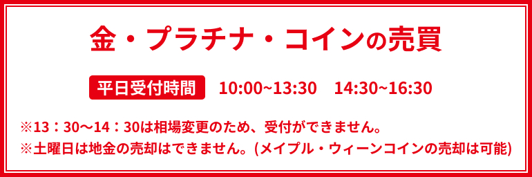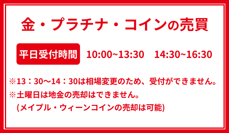 土曜日・祝日は、ご購入の受付のみで、一部の金貨・プラチナコインを除き、ご売却は承っておりません。